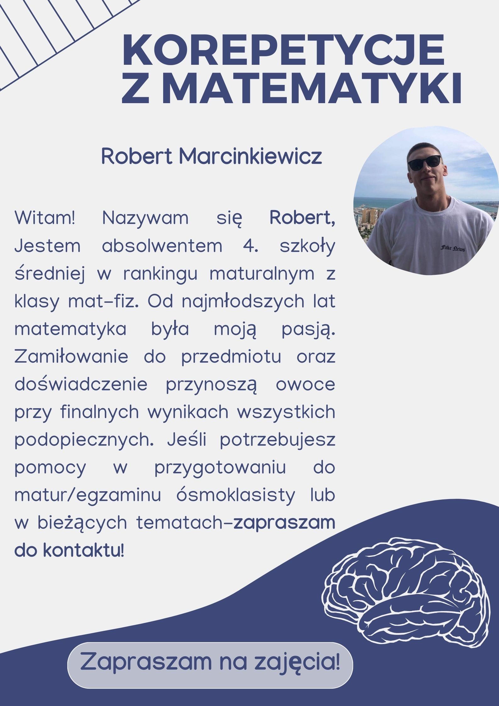 Witam, nazywam się Dominik i matematyka zawsze była moją pasją, jestem maturzystą ale korepetycji udzielam już od 2 klasy liceum. Gwarantuje ci dobre i łatwe w zrozumieniu lekcje oraz gwarantuje wysoki wynik z egzaminu 8-klasisty. Sam zdałem go na poziomie 98%