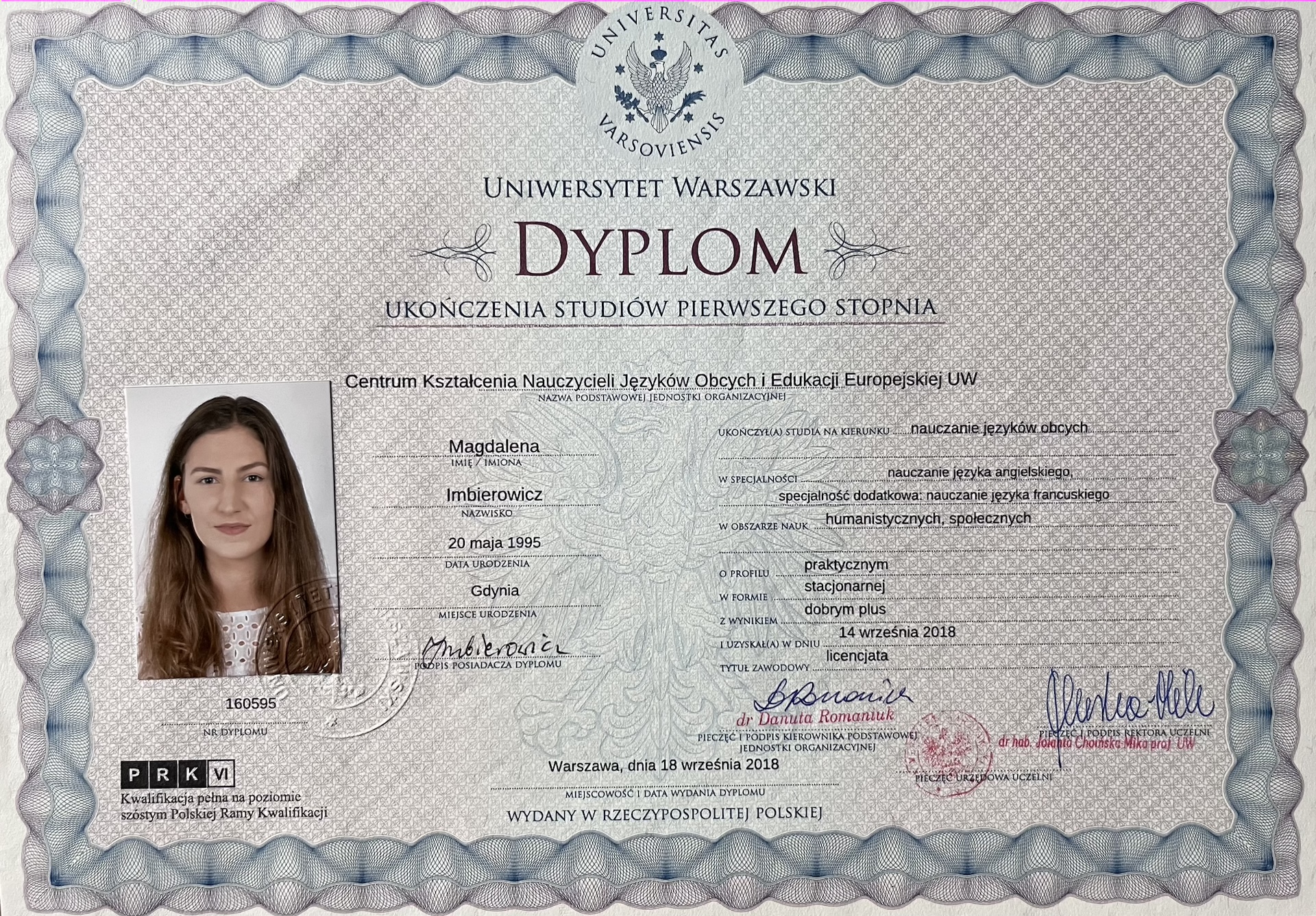 Studiowałam licencjat z Nauczania j. angielskiego i francuskiego na Uniwersytecie Warszawskim oraz magisterkę z Zarządzania w Szkole Głównej Handlowej w Warszawie. Zrealizowałam wiele godzin praktyk zarówno z j. angielskiego jak i francuskiego w placówkach edukacyjnych w Warszawie. Posiadam wiedzę z zakresu mediów, marketingu, sprzedaży i obsługi klienta. Moje zainteresowania to m. in. psychologia, media, marketing, muzyka, zdrowie, moda i behawiorystyka psów.