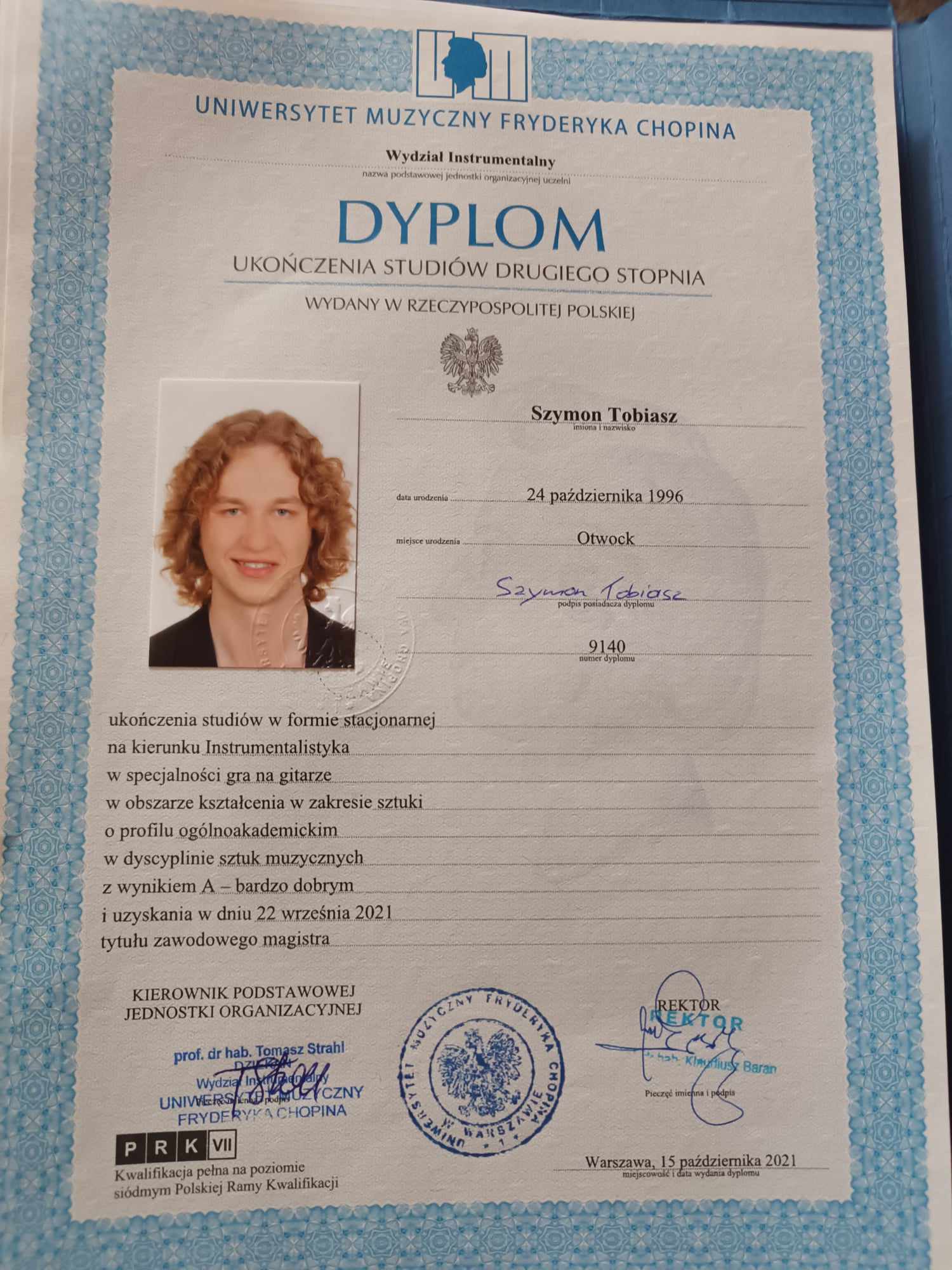 Cześć, jestem Szymon. Mam 28 lat, na gitarze gram od 17 lat. Trzy lata temu ukończyłem studia magisterskie w klasie gitary klasycznej na Uniwersytecie Muzycznym Fryderyka Chopina w Warszawie. Moją specjalnością jest gra na gitarze klasycznej. Posiadam również wykształcenie pedagogiczne.