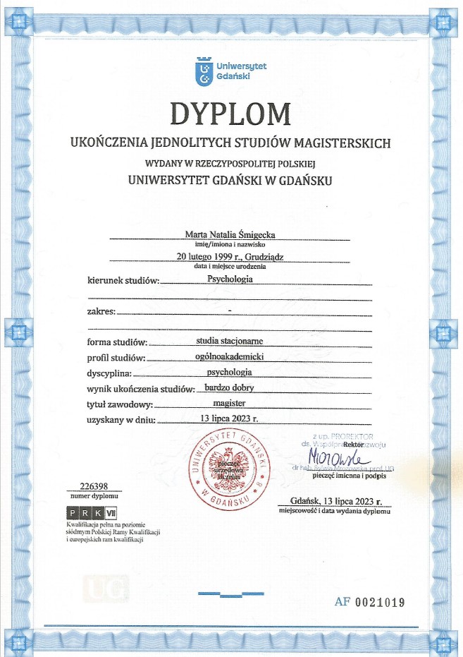 Studia ukończyłam w lipcu 2023. Uzyskałam tytuł magistra psychologii na Uniwersytecie Gdańskim. Obecnie zdobywam również wiedzę z seksuologii na studiach podyplomowych.
