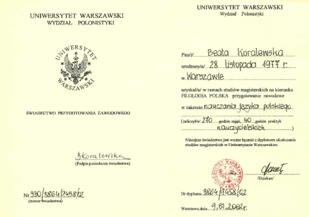 Przygotowuję do matury podstawowej i rozszerzonej, prowadzę warsztaty dziennikarskie i kursy przygotowujace do matury podstawowej i rozszerzonej. Posiadam uprawnienia do zajęć dziennikarskich, prowadzę zajęcia na UW i warsztaty w TVP.