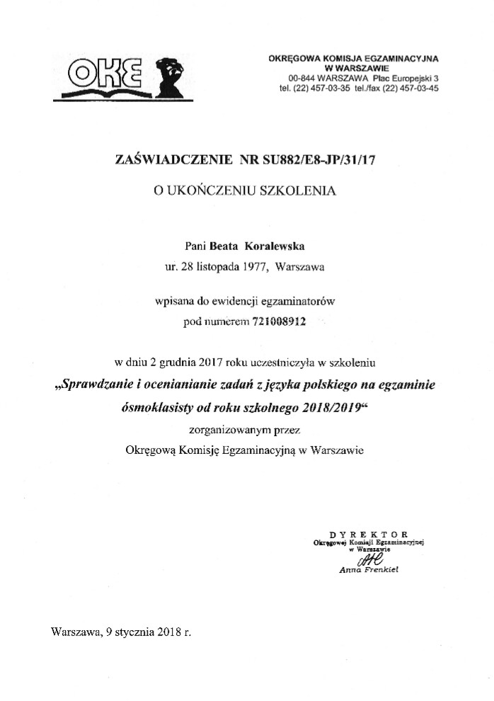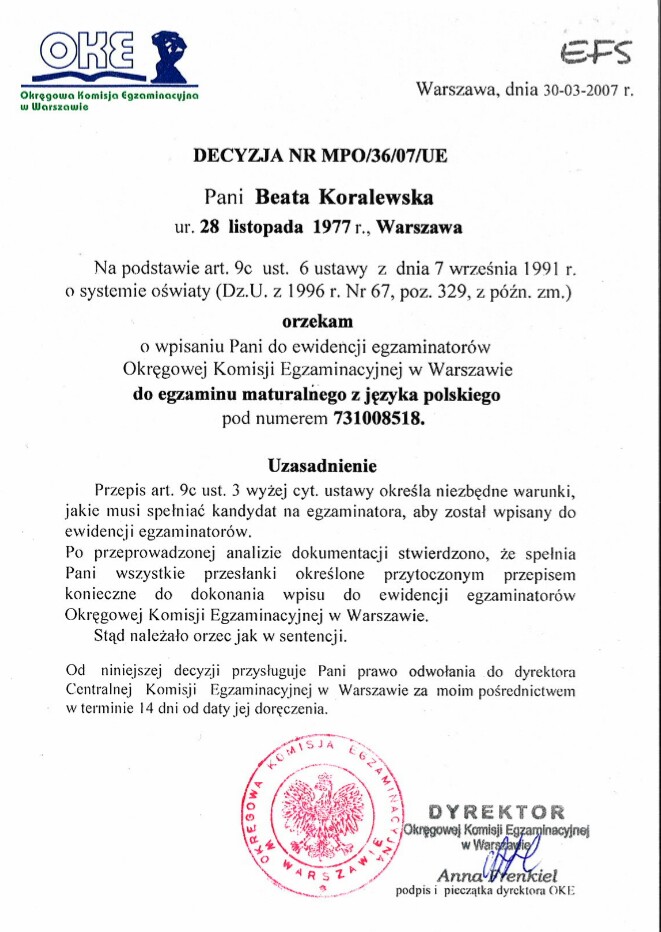 Jestem nauczycielem dyplomowanym, egzaminatorem weryfikatorem OKE.