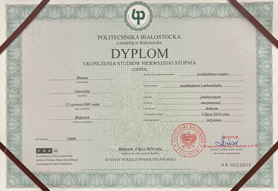 Ukończenie studiów Architektury Wnętrz w 2024 roku, inżynier. W 2023 roku ukończenie Warszawskiej Szkoły Filmowej - spec. Fotografia