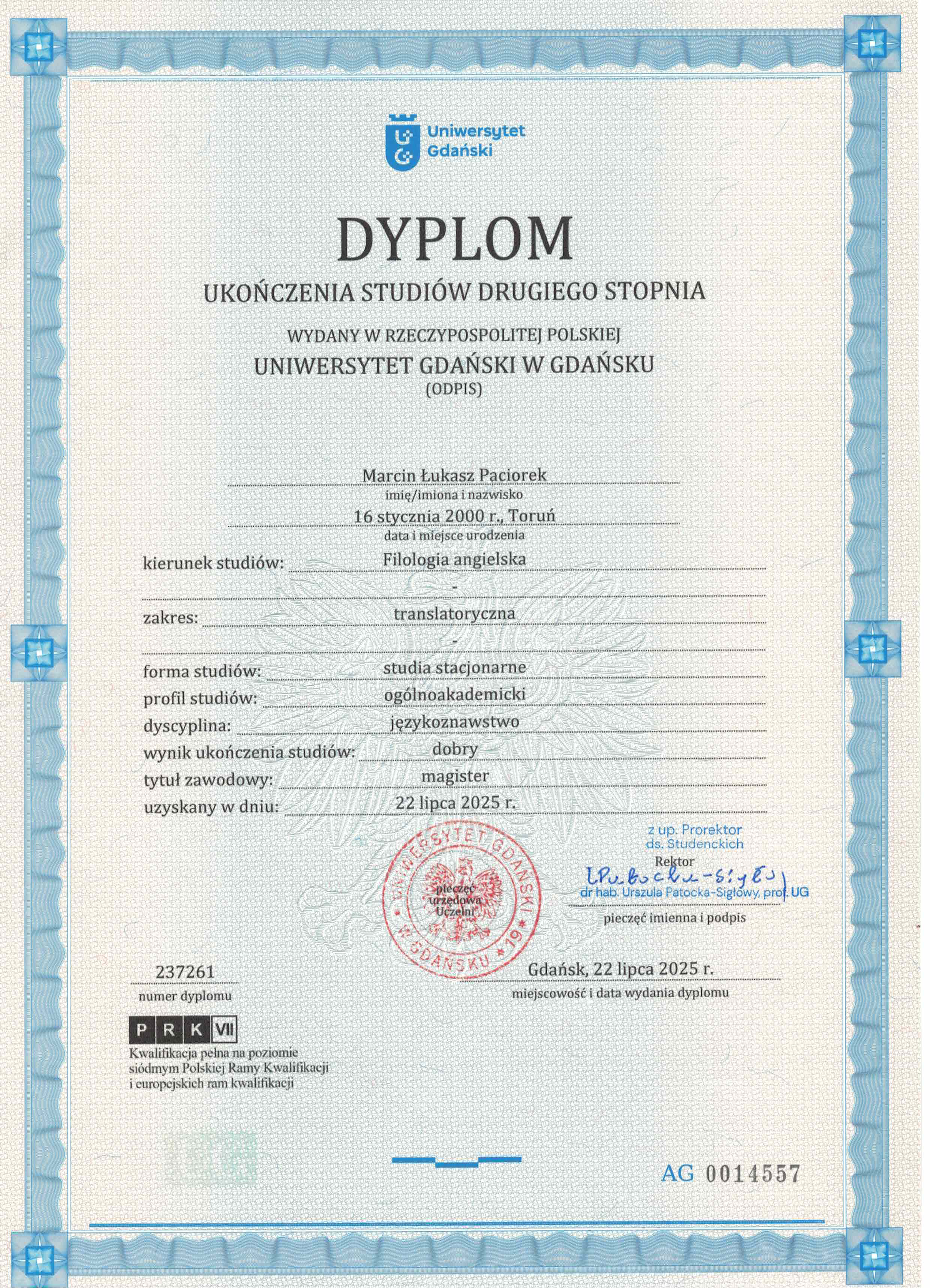 Jestem magistrem filologii angielskiej ze specjalnością w tłumaczeniach, chociaż moją pasją jest również nauczanie innych.