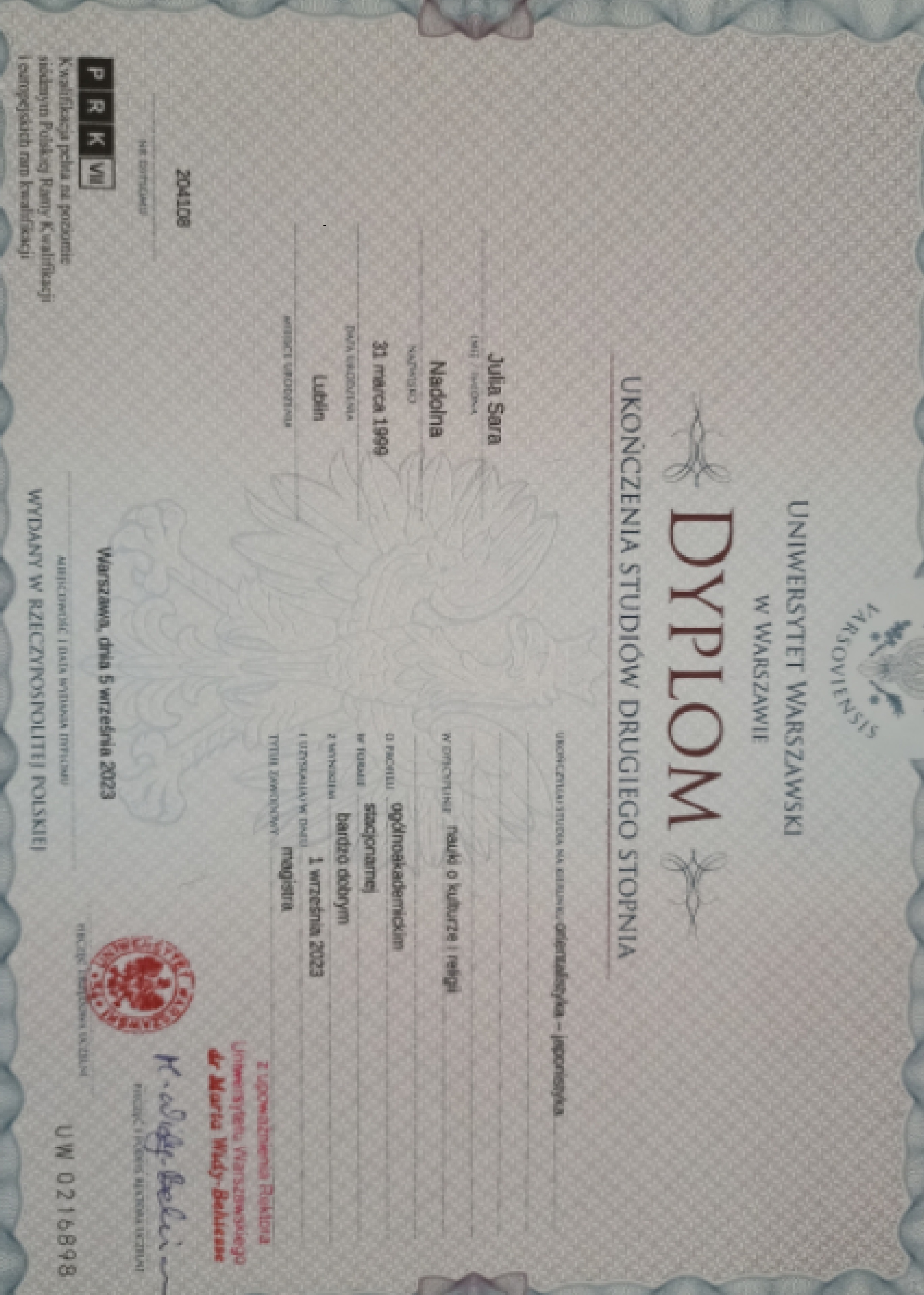 Ukończyłam licencjat na Uniwersytecie Adama Mickiewicza w Poznaniu, a następnie studia magisterskie na Uniwersytecie Warszawskim. Od ponad 3 lat pomagam zarówno początkującym, jak i bardziej zaawansowanym kursantom w nauce języków obcych: japońskiego oraz angielskiego.