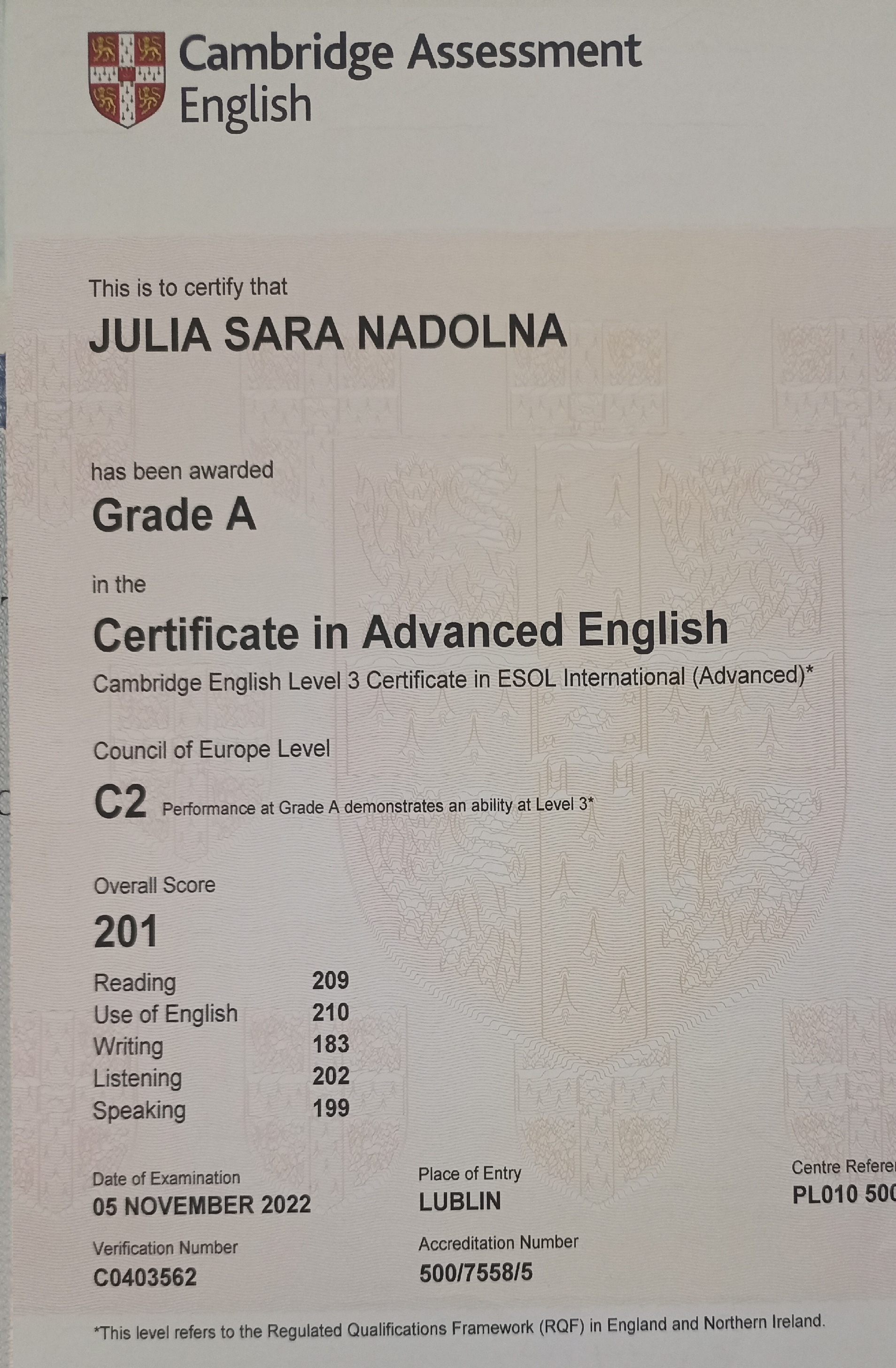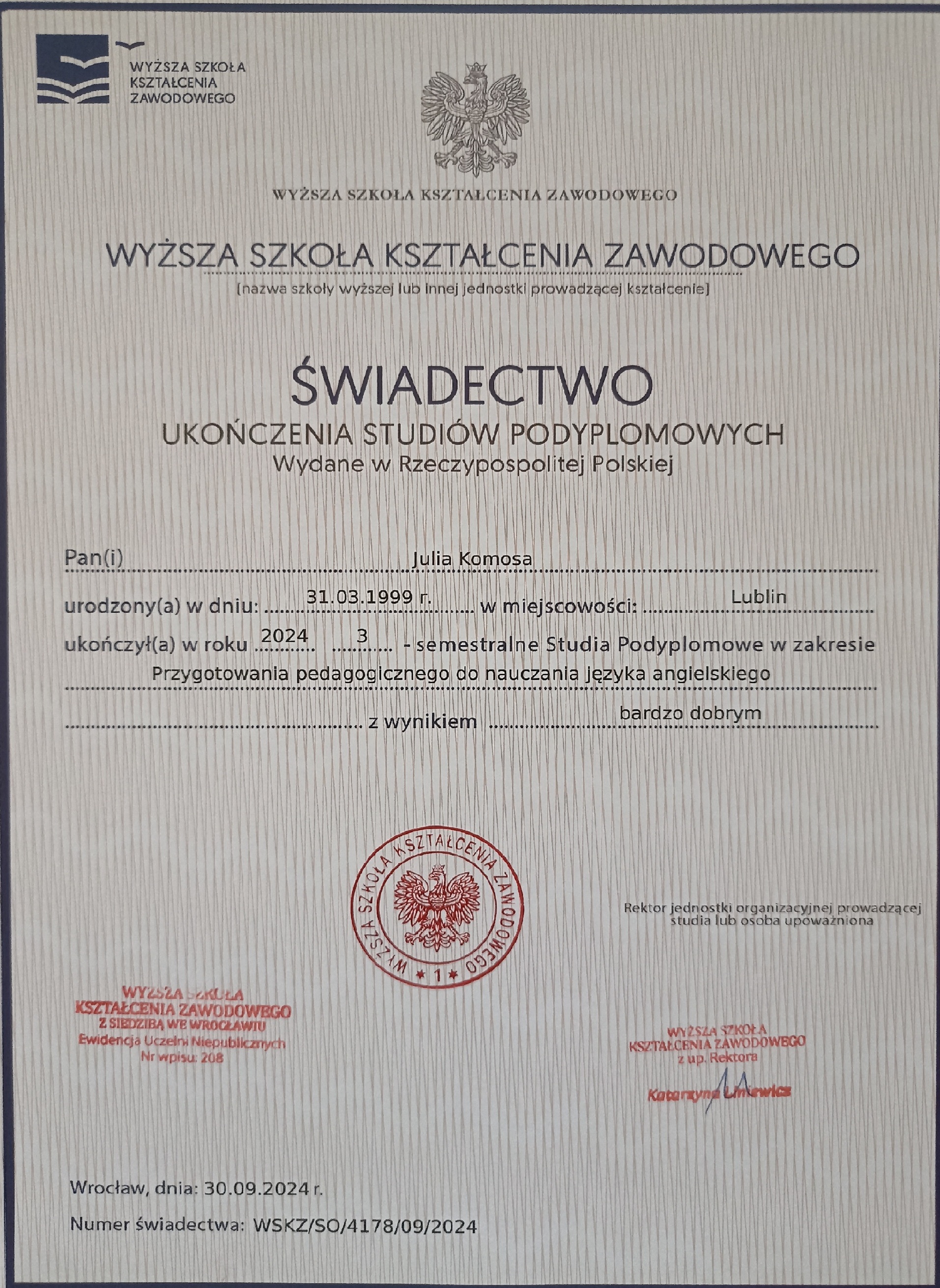 Posiadam certyfikat CAE zdany na CEFR C2. Dodatkowo ukończyłam studia podyplomowe w zakresie nauczania języka obcego dla szkół podstawowych oraz średnich.