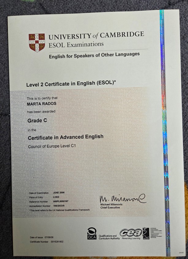 Posiadam certyfikat CAE. Ukończyłam studia inżynierskie z wykładowym językiem angielskim. W okresie studiów przez 6 lat udzielałam korepetycji osobom w wieku od 3 do 70 lat. Pracowałam również jako lektor w szkole językowej. Od 12 lat pracuję w międzynarodowej korporacji, gdzie posługuje się językiem angielskim częściej niż polskim.