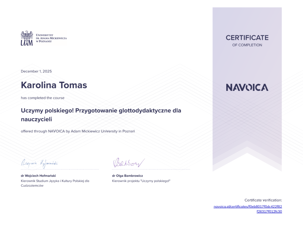I’m a 30-year-old language nerd, digital nomad in the making, and your future Polish language mentor. Currently, I'm studying English Philology and building my career as a teacher of Polish as a foreign language — supporting learners like you in expressing themselves freely. Deep down, I know this is more than learning. It’s becoming.