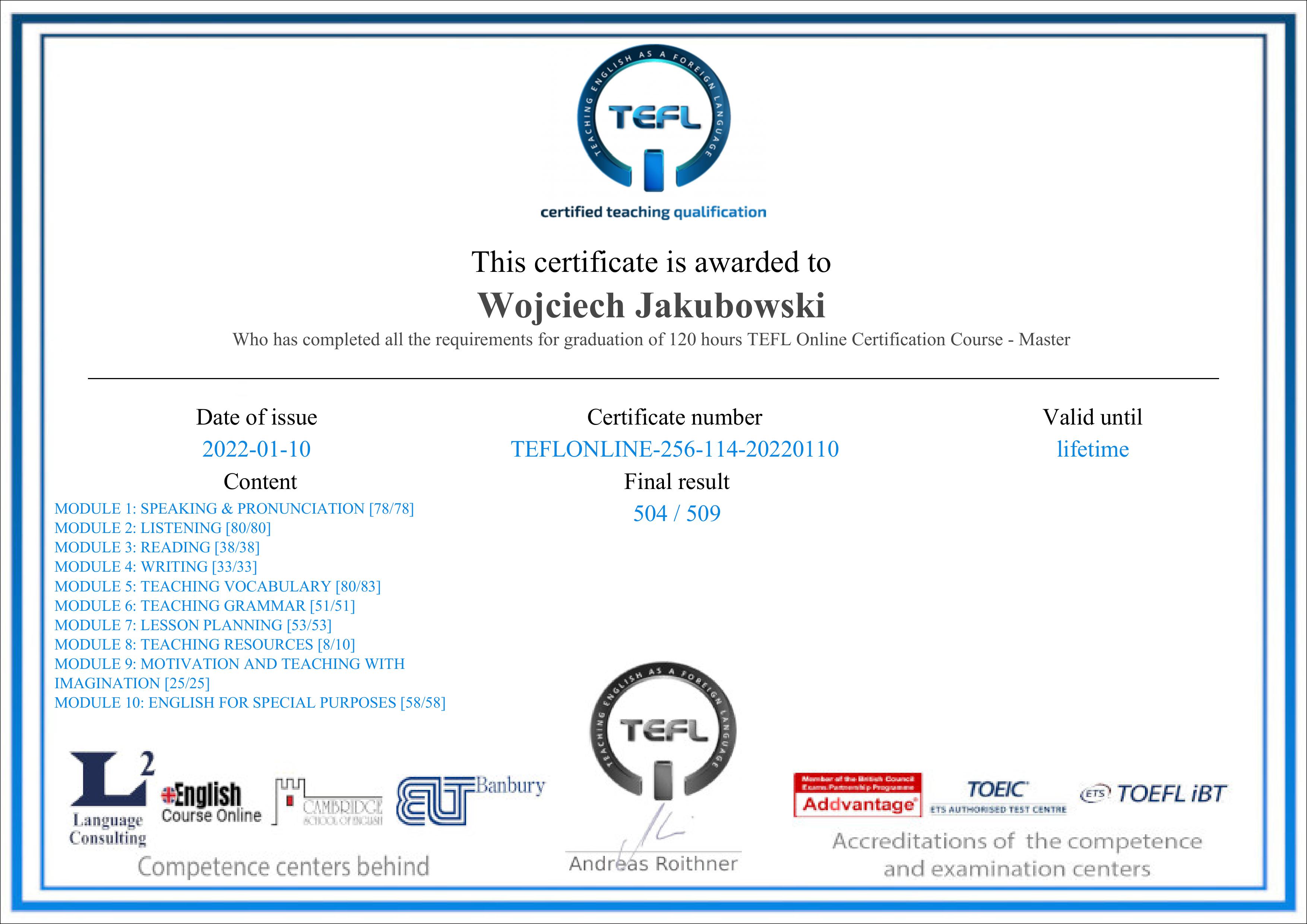 Języki obce są moją pasją, daje mi ogromną satysfakcję obserwowanie jak moi klienci odnoszą sukcesy czy to przy przygotowywaniu się do certyfikatów językowych czy też rozwoju swojej kariery. Oprócz angielskiego na poziomie C2, znam na poziomie C1 języki włoski, niemiecki i francuski a obecnie uczę się samemu od podstaw rosyjskiego i chińskiego.