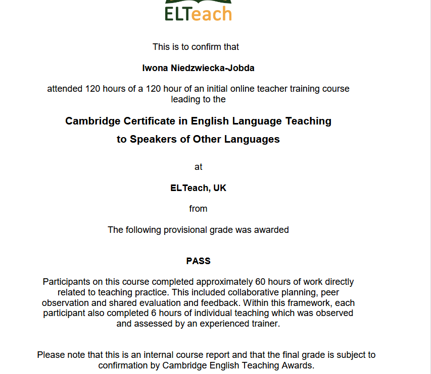 Jestem certyfikowanym nauczycielem (CELTA UK) z ponad 7-letnim doświadczeniem z dziećmi, młodzieżą i dorosłymi. Posiadam przygotowanie pedagogiczne, pracuję jako nauczyciel języka angielskiego. Uczę dzieci, młodzież i dorosłych. Przygotowuję do egzaminów, pomagam w zaległościach, prowadzę konwersacje. Moi uczniowie osiągają wspaniałe wyniki!