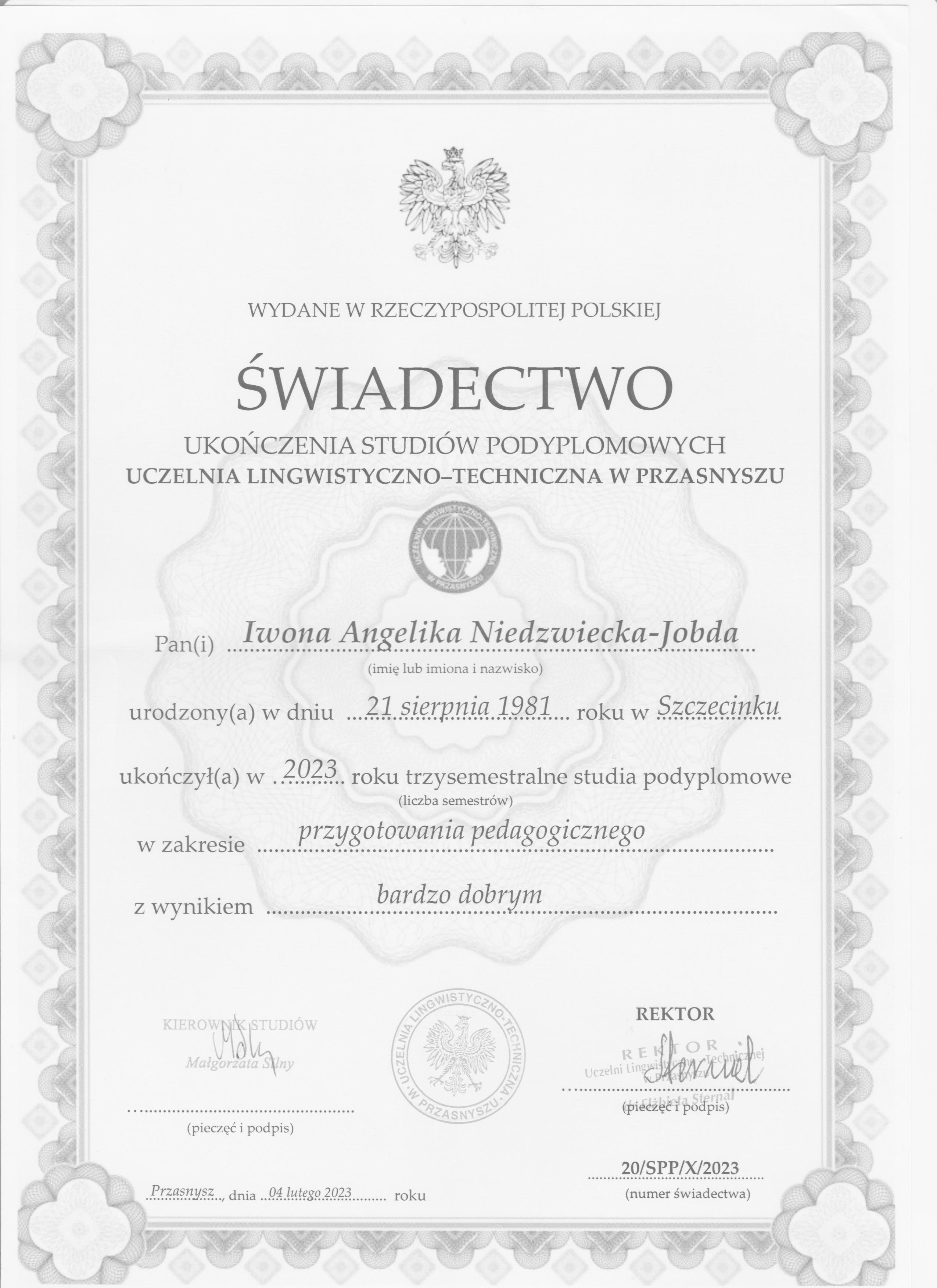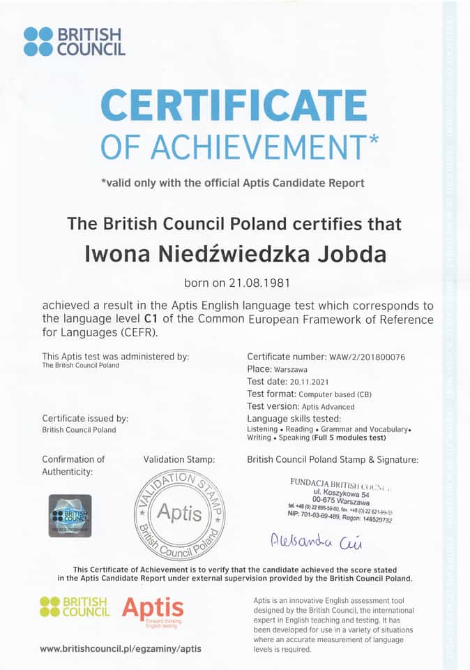 Moje kompetencje potwierdzają zarówno kwalifikacje metodyczne, jak i formalne wykształcenie: ukończyłem CELTA (UK) – jeden z najbardziej cenionych na świecie certyfikatów metodycznych dla nauczycieli angielskiego, posiadam studia podyplomowe z zakresu przygotowania pedagogicznego a także certyfikat potwierdzający zaawansowaną znajomość języka angielskiego.
