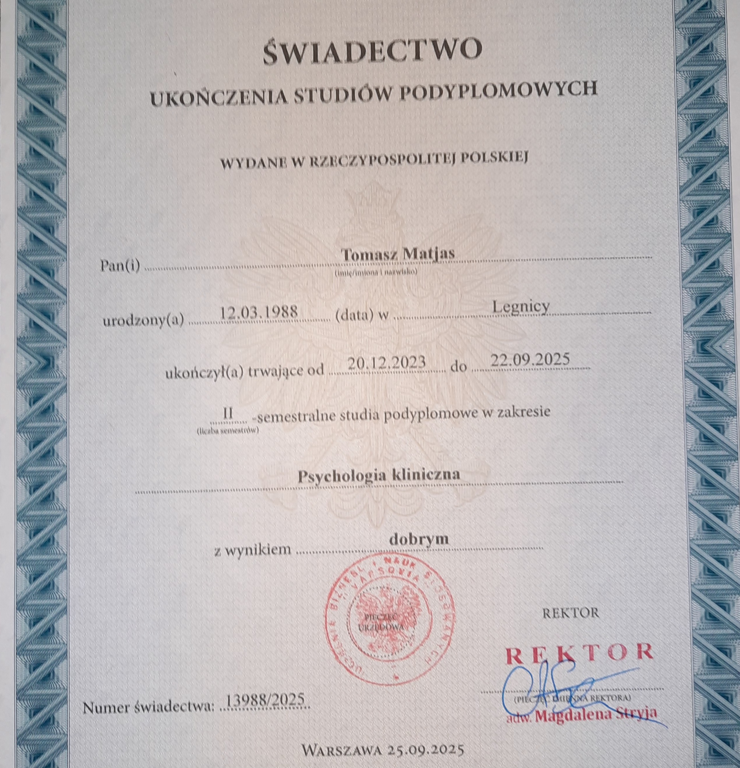 uzyskałem prestiżowy, międzynarodowy stopień Master of Science Psychology Clinical po odbyciu 3 letnich studiów podyplomowych z psychologii klinicznej