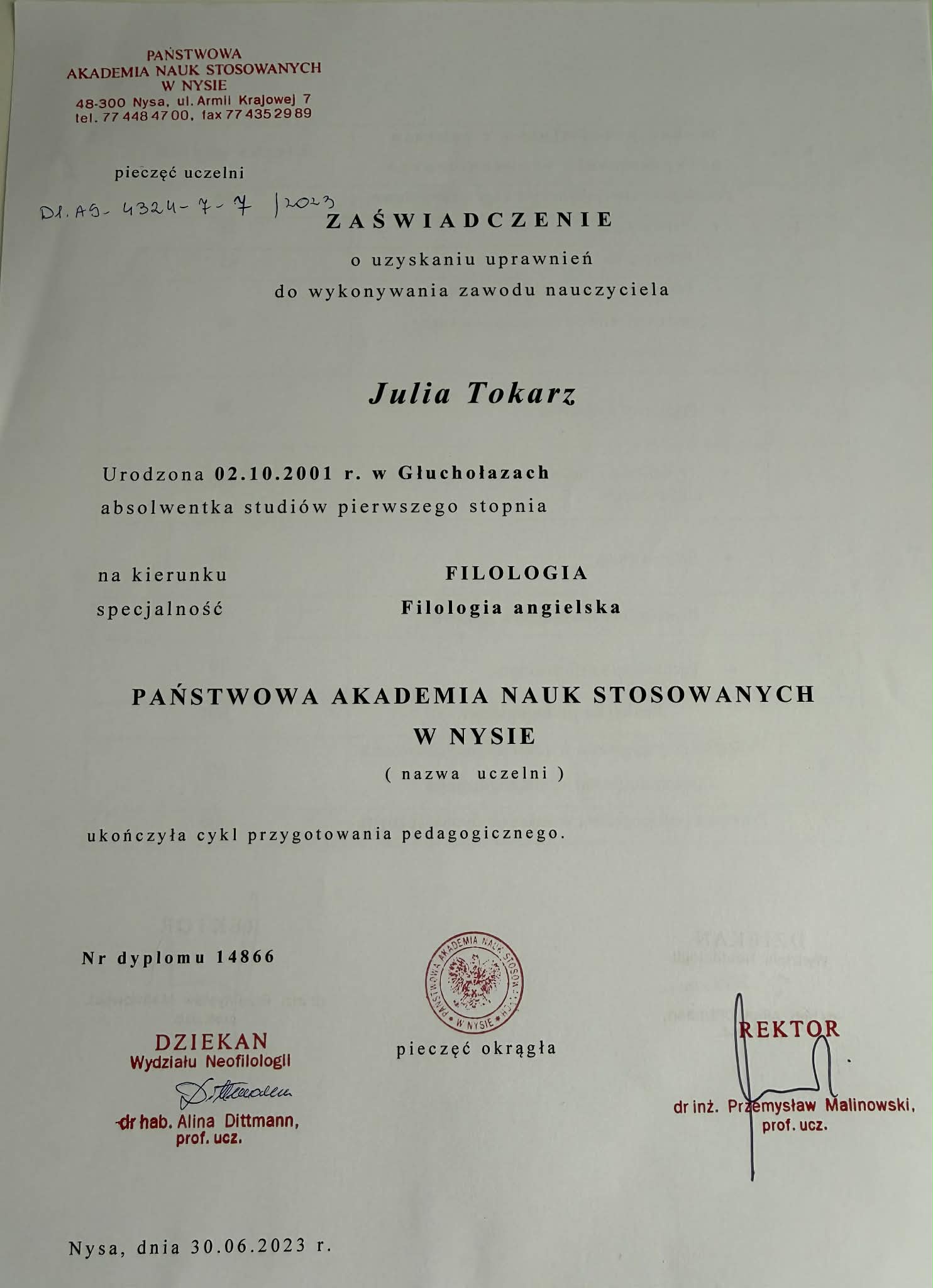 Mam na imię Julia, mam 24 lata i uwielbiam uczyć języka angielskiego i polskiego. W wolnych chwilach uprawiam sport, chodzę po górach, zagłębiam się w psychologię i robię zdjęcia.