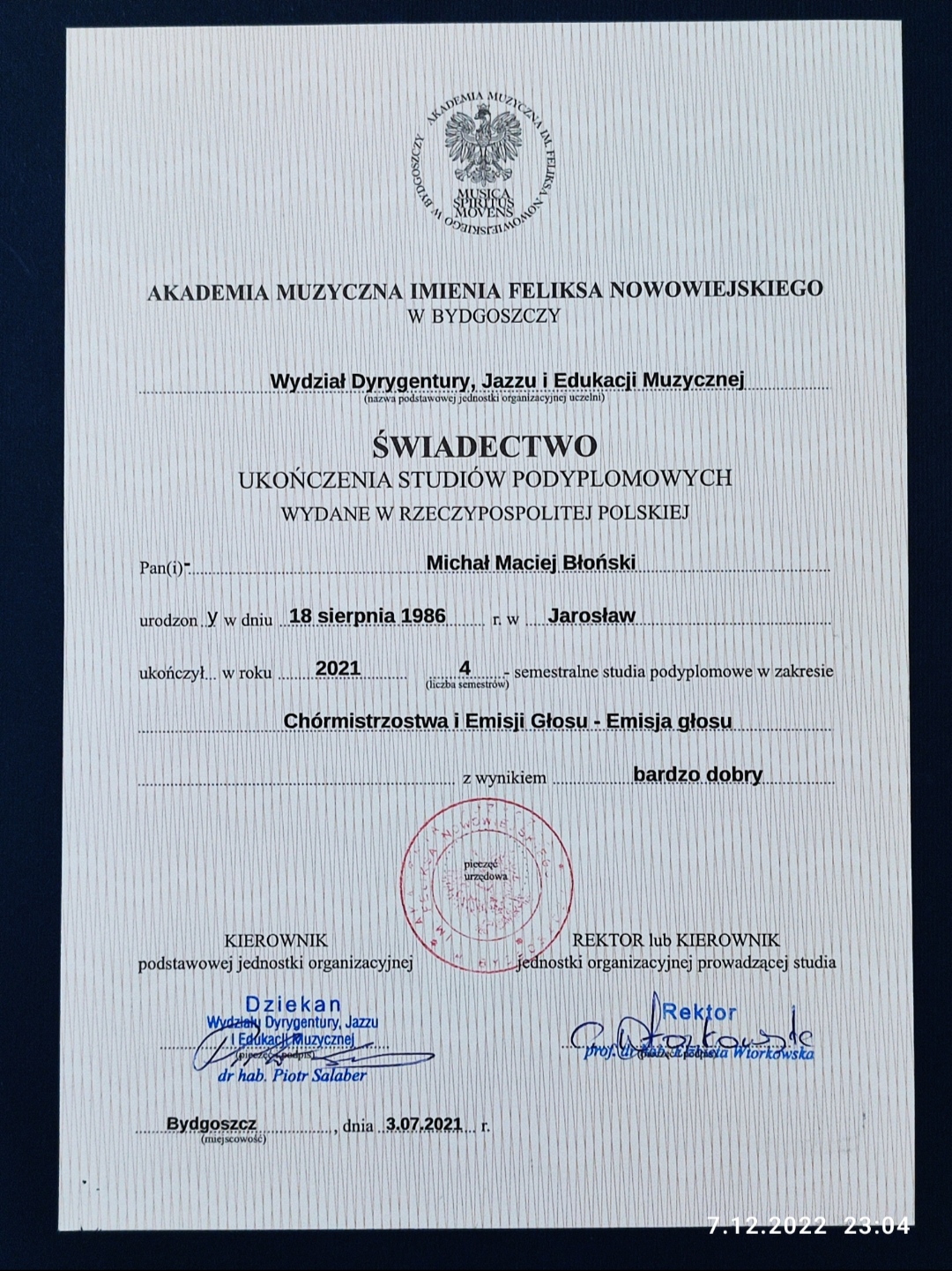 Posiadanie dokumentów, potwierdzających wykształcenie