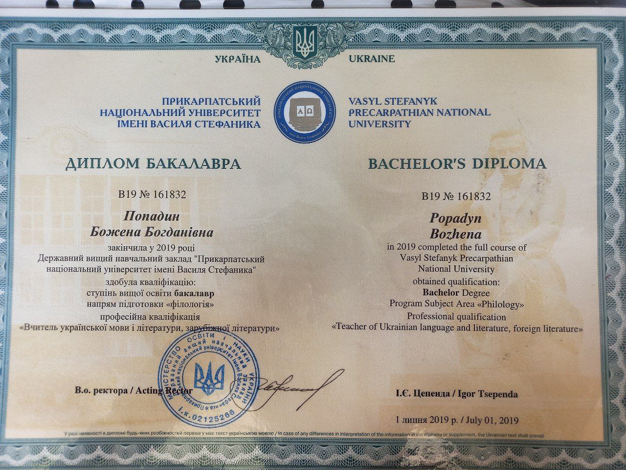 Cześć jestem nauczycielką z Ukrainy. Przyjechałam do Polski w lutym 2022 roku, uciekając od wojny. Mam wykształcenie wyższe które zdobyłam w Ukrainie na Vasyl Stefanyk Precarpathian National University. Z zawodu jestem filologiem oraz pedagogiem.