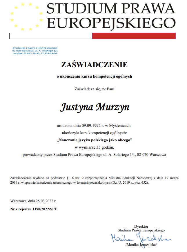 Jestem magistrem filologii angielskiej z niemieckim i hiszpańskim. Ukończyłam kurs nauczania języka polskiego jako obcego. Zajmuję się edukacją od ponad 7 lat.